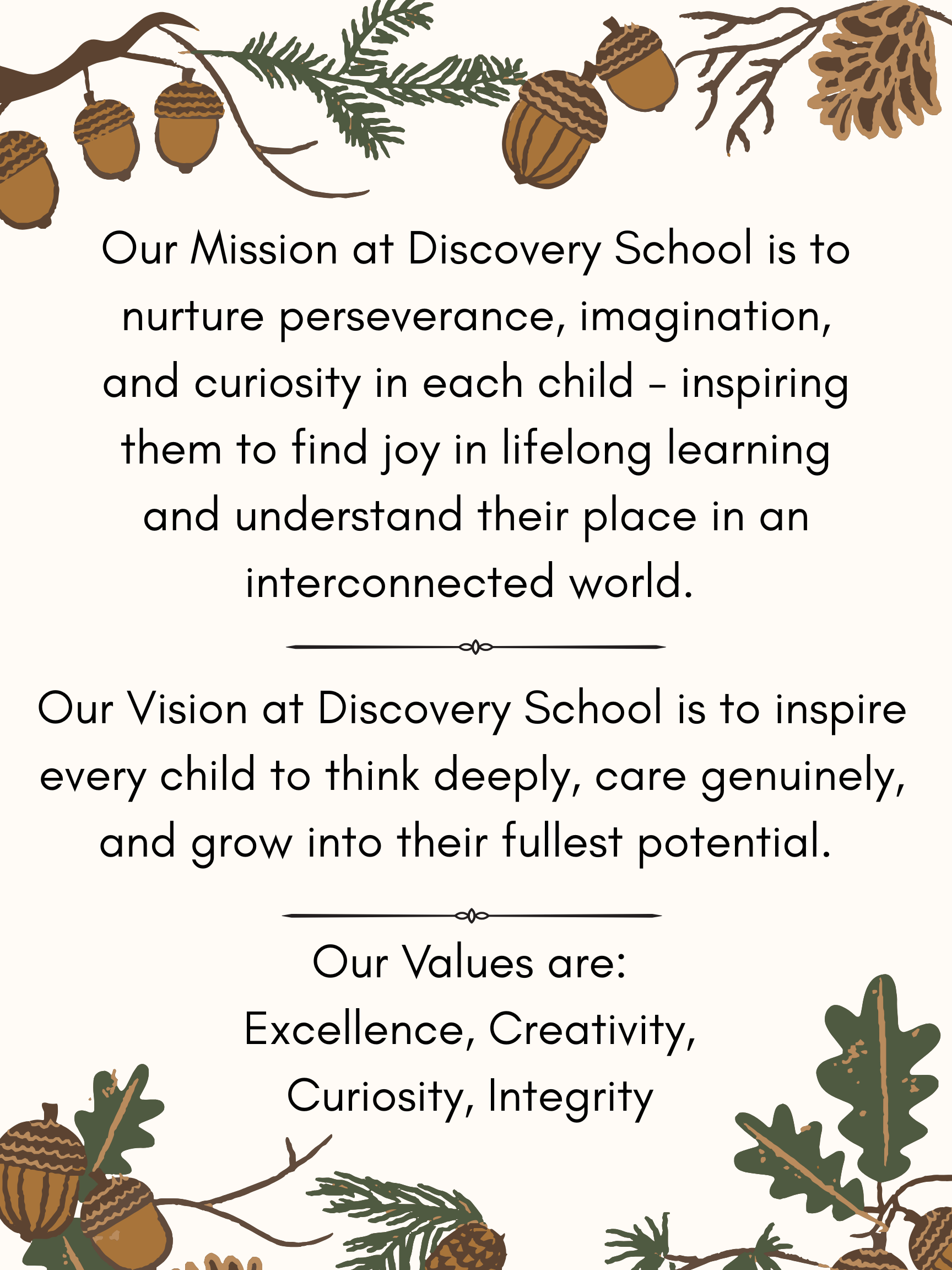 We prioritize outdoor learning from the environment around us, taking full advantage of the 40 acres of woods surrounding the school. Discovery students benefit from that idea of being balanced learners with a full academic morning centered around core subjects like reading, writing, mathematics, and the IB Program of Inquiry, moving to three related specialist subjects in the afternoon including woods, genius hour, STEM, visual art, music, library, Spanish, physical education, and health. Enrichment classes on Friday afternoons allow teachers and community members to share their passions and knowledge with students who choose from those offerings they are most interested in. Past offerings have included board games club, comic book clubs, art club, salsa dancing, urban farming, meditation, and more.